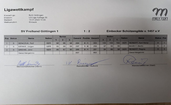 Der zweite Wettkampf am heutigen Tag endet mit einem 2:1 Sieg gegen den SV Freihand Göttingen.